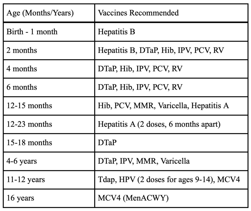 12. MCV4 (Meningococcal Conjugate Vaccine): MCV4 vaccine protects against meningococcal bacteria, which can cause meningitis and bloodstream infections. Given at 11-12 years of age with a booster dose at 16 years of age to provide immunity against meningococcal disease during adolescence and early adulthood.